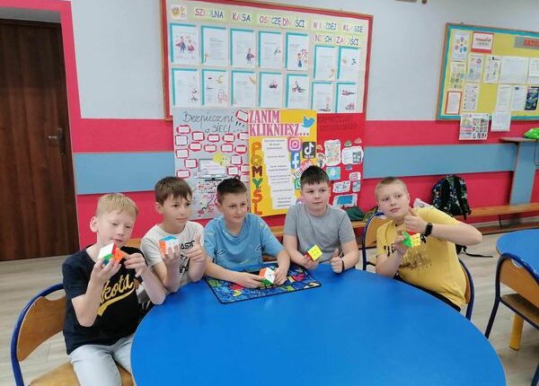 Dnia 17 kwietnia 2024 r. w naszej szkole odbył się I Szkolny Turniej w układaniu kostki Rubika na czas. Zawodnicy rywalizowali w konkurencji – kostka 3x3x3. Do rywalizacji zgłosiło się 5 chłopców. Konkurs został zorganizowany dla jeszcze większego rozpropagowania tego pięknego hobby i pokazania uczniom, że gry logiczne w połączeniu z elementem rywalizacji mogą być świetną alternatywą na spędzanie wolnego czasu. Wielkie emocje i ogromna rywalizacja towarzyszyła zawodnikom w czasie trwania całego konkursu. Najlepszy czas uzyskany przez uczestnika to 42 sekundy. Najczęściej wyniki plasowały się poniżej jednej minuty – GRATULUJEMY.