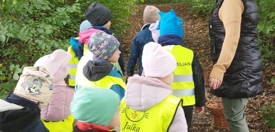 Jesień to piękna i kolorowa pora roku, dlatego korzystając ze słonecznego dnia, wybraliśmy się na wycieczkę do lasu, by obserwować jesienne pejzaże i zebrać jesienne dary lasu do kącika przyrody.