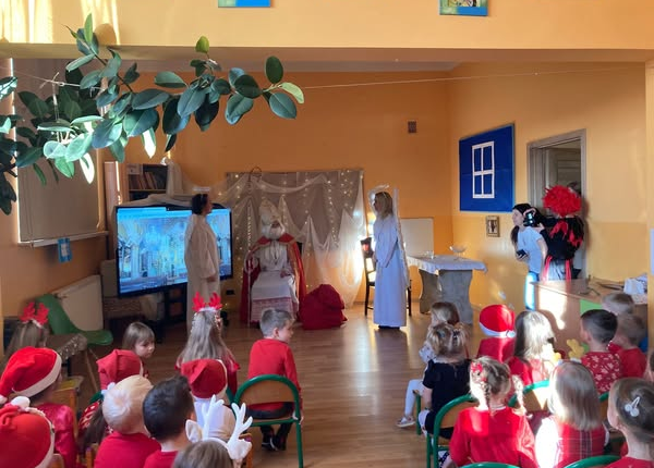 „Szóstego grudnia, na całym świecie,Święty Mikołaj odwiedza dzieci.Pędzi na saniach z reniferami,za chwilę stanie przed naszymi drzwiami.Dużo podarków w swym worku niesie,tobie na pewno też coś przyniesie.” W piątek nasze przedszkole odwiedził Święty Mikołaj, ale przed jego przyjściem dzieci obejrzały inscenizację pt. ,,Prawdziwa historia o Mikołaju”” w wykonaniu rodziców, ks. Karola i uczniów kl 8. Dziękujemy grupie teatralnej za przygotowanie