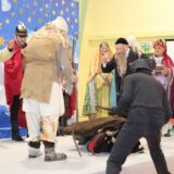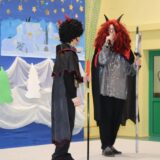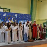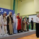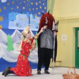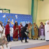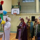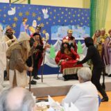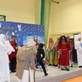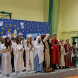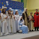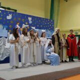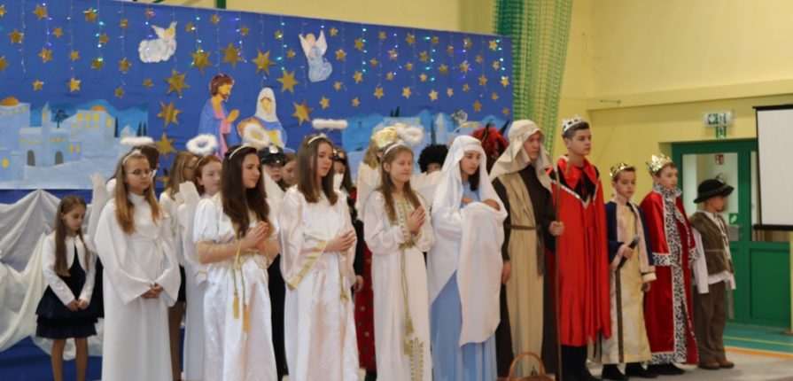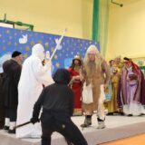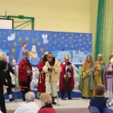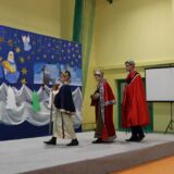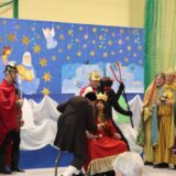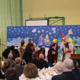 Po jej wystąpieniu na scenie zaprezentowali się uczniowie, którzy przedstawili humorystyczną, współczesną wersję narodzenia Jezusa, przygotowaną pod kierunkiem pań: Kingi Konar, Anny Nowak i Marty Cichostępskiej. Historia ta prezentowała zmagania Lucyfera i diabła Rokity mające na celu zawładnięcie światem i pomoc Herodowi w utrzymaniu władzy. Oczywiście zwyciężyło dobro, a podstępy diabelskie zostały odkryte przez spostrzegawcze anioły i Jezus mógł spokojnie się narodzić. Nie zabrakło także pastuszków i  Trzech Króli, którzy jako pierwsi przybyli, by pokłonić się Dzieciątku Jezus. Aktorzy doskonale wcielili się w swoje role, a ich grę aktorską wzbogacił piękny śpiew szkolnego chórku, za co zostali nagrodzeni gromkimi brawami. Kolejnym punktem programu był występ Kolędników znad Uszwicy, który zapowiedziała p. Anna Korczyńska, prezentując historię grupy kolędniczej oraz jej dotychczasowe sukcesy. Przedstawienie pt. ,,Herody” dostarczyło zebranym sporej dawki śmiechu oraz wrażeń muzycznych, gdyż rzadko można słyszeć iście niebiański śpiew w wykonaniu mężczyzn. Kolędnicy, jak to bywa w zwyczaju, oczekiwali po złożeniu świątecznych życzeń na stosowną zapłatę. Pani Dyrektor jako gospodarz uroczystości była przygotowana na ten moment i wraz z podziękowaniami wręczyła kolędnikom upominek oraz zaprosiła do wspólnego świętowana przy wigilijnym stole. Słowa podziękowania skierowała także do osób i organizacji wspierających przygotowanie tego spotkania wigilijnego: Gminnego Ośrodka Pomocy Społecznej na ręce kierownika- p. Kingi Broszkiewicz- Kuchno, Księdza Proboszcza, Caritas Parafialnego, Wójta Gminy Gnojnik, nauczycieli, rodziców oraz młodzieży szkolnej. Złożyła także wszystkim obecnym życzenia, a po wspólnej modlitwie, połamaliśmy się opłatkiem i zasiedliśmy do wieczerzy wigilijnej. Całej uroczystości towarzyszył świąteczny nastrój, pełen ciepła i rodzinnej atmosfery. Seniorzy i Goście, opuszczając mury naszej szkoły, zostali obdarowani pierniczkami oraz gipsowymi szopkami.