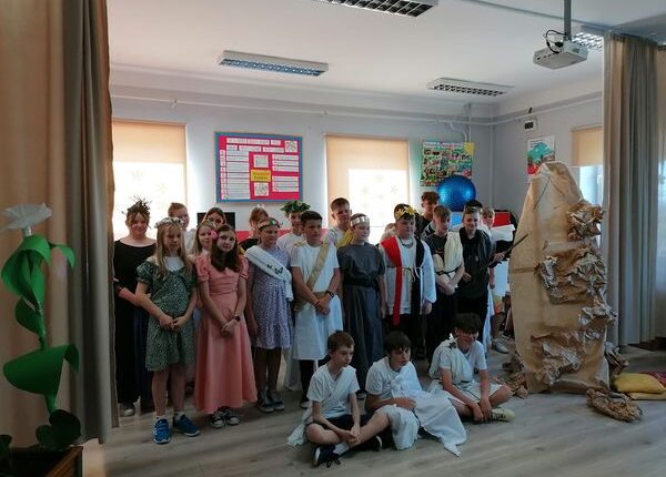 Dnia 16 maja 2024 r. uczniowie klas V-VII przygotowali przedstawienie teatralne pt. „Mity greckie”. Zaproszeni uczniowie klas młodszych przenieśli się na chwilę w świat starożytnych Greków i choć na krótko zamieszkali na Olimpie. Poznali niektóre postacie mitologiczne, takie jak: Prometeusz, Syzyf, Zeus, Demeter, Kora, Narcyz. Uczniowie mogli zwrócić uwagę na przeznaczenie, które kierowało losem bogów. Gra młodych aktorów na scenie dostarczyła wielu wrażeń i była doskonałą formą przekazu w jakim świecie żyli bogowie. Przedstawienie było podsumowaniem działań zajęć polonistycznych.