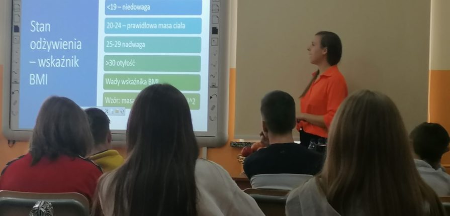 Dnia 20 marca 20022 r. w ramach realizacji programu „Trzymaj Formę” w naszej szkole gościliśmy specjalistkę w dziedzinie żywienia, panią dietetyk Aleksandrę Gawlik. W zajęciach udział wzięli uczniowie klas VII-VIII. Celem spotkania było zwrócenie uwagi na prawidłowe odżywianie, zdrowy styl życia oraz dietę dostosowaną dla dzieci w wieku szkolnym. Pani dietetyk wytłumaczyła nam, jak świadomie i zdrowo się odżywiać, a także jakich dodatków do żywności unikać. Pokazała nam jak odczytywać etykiety zamieszczone na produktach oraz w jaki sposób obliczyć swoje BMI.